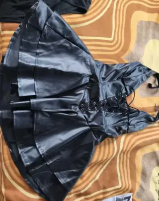 Elegante abito corto con un design moderno e audace. Perfetto per serate speciali. - Materiale effetto pelle lucida. - Scollo a cuore e spalline. - Gonna a balze. - Linea aderente sul busto e svasata.