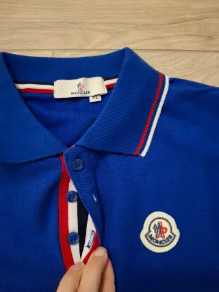 Polo Moncler originale, perfetto per un look casual ma ricercato. - Logo Moncler sul petto. - Colletto a contrasto con dettagli rossi e bianchi. - Abbottonatura frontale. - Dettagli con bottoni sui lati.
