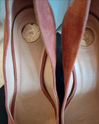 Eleganti décolleté con tacco alto e plateau. - Materiale scamosciato. - Punta aperta. - Logo sul sottopiede. Slanciano le gambe con logo dorato qualche ombra del colore dato dal camoscio vedere foto alone fatta mettere soletta antiscivolo con scatola originale Elisabetta franchi