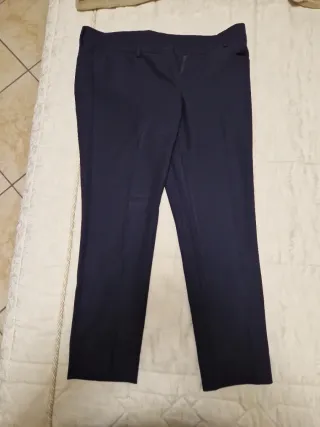 Pantalone da donna di colore blu. - Tessuto con inserti a coste. - Vita media. - Gamba dritta.