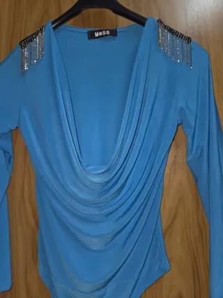Elegante abito blu con dettagli scintillanti sulle spalle. - Scollo a V drappeggiato. - Maniche lunghe. - Dettagli con frange e strass sulle spalle.