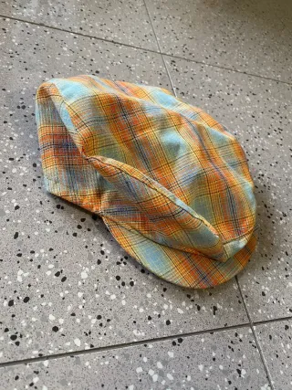 Cappello con un design old style e una fantasia a quadri. - Taglia unica. - Fantasia a quadri con tonalità arancioni, gialle e azzurre.