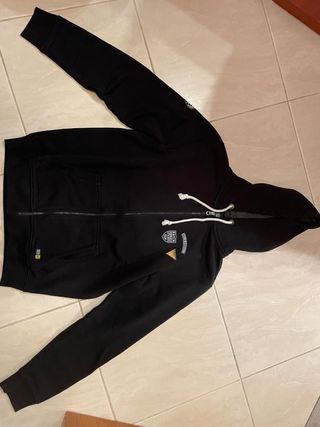 Felpa con la Zip marca Golden Equation di colore blu con bande bianche e rosse sulle spalle. 70% cotone, 30% poliestere, taglia L, condizioni buone
