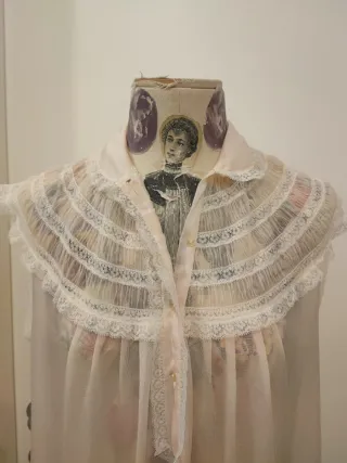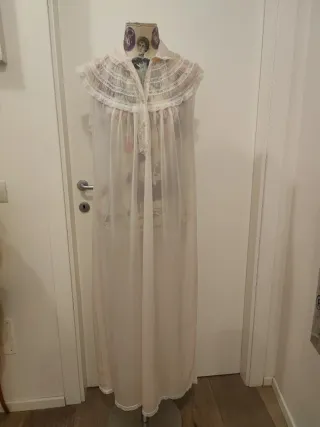 Camicia da notte vintage degli anni '60, mai indossata. Un capo delicato e romantico. - Tessuto leggero e trasparente. - Dettagli in pizzo sul colletto e sull'orlo. - Chiusura con bottoncini sul davanti. - Lunghezza fino alle caviglie.