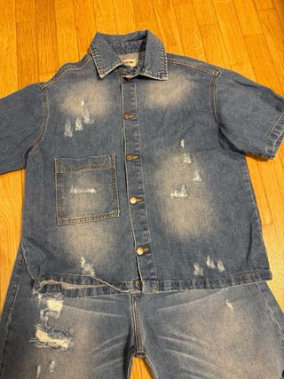Completo composto da camicia e pantaloni in denim. - Camicia a maniche corte con bottoni. - Pantaloni con strappi e orlo sfrangiato. - Design effetto used.