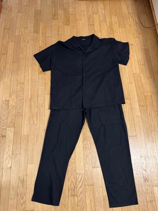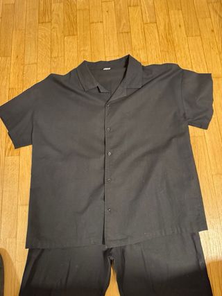 Completo in lino nero. - Camicia a maniche corte con colletto. - Pantaloni lunghi.