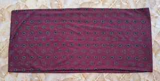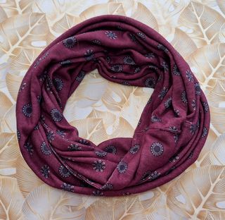 Snood borgogna con fantasia in nero e bianco. Misura distesa 73x33 cm e può essere indossata in vari modi, sia come sciarpa che come copricapo. Non ci sono etichette che indichino la composizione del tessuto, sembrerebbe cotone abbastanza caldo ma sottile e molto morbido. In ottimo stato