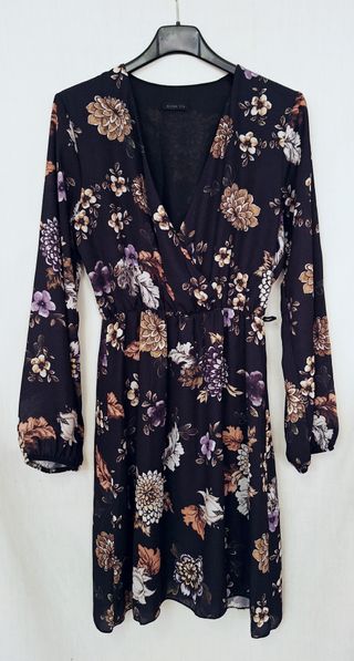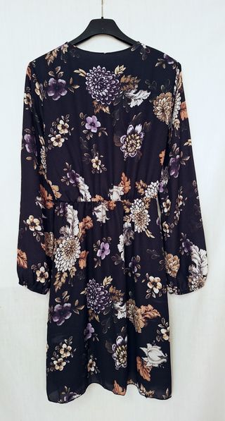 Vestito Nuna Lie nero con motivo florealenei toni dell'avorio, del beige, del marroncino e del viola. Scollo a V incrociato; elastico in vita e sui polsini. In poliestere, con sottogonna. In ottimo stato. Taglia S: spalle 37,5 cm, petto 45 cm, maniche 58 cm, vita 27 cm (si estende fino a 38), lunghezza 86,5 cm