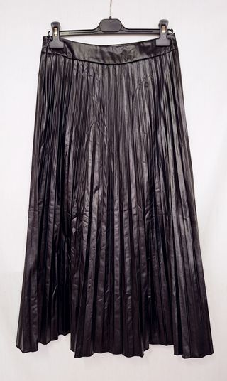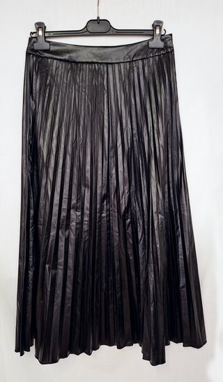 Gonna lunga Shein in similpelle nera, plissettata. Chiusura laterale con cerniera. Non ci sono etichette che indichino la composizione del tessuto, la parte interna è leggermente felpata. In ottimo stato. Taglia M: vita 36 cm, lunghezza 83,5 cm