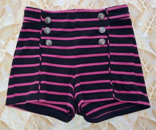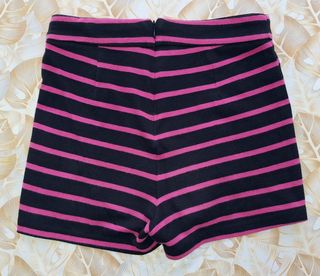 Pantaloncini Forever21 a righe nere e fuxia, con bottini in metallo argentato puramente decorativi. Non ci sono etichette che indichino la composizione del tessuto, è adatto alla mezza stagione o alla stagione invernale con un collant spesso. ad esempio. Chiusura posteriore con cerniera. In ottimo stato. Taglia L/G: vita 32,5 cm, fianchi 42 cm, lunghezza 34 cm