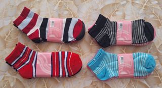 Set 12 paia di calzini (4 confezioni da 3 paia ciascuna) Tutti i giorni con me a righe. Tessuto 80% cotone, 15% poliammide e 5% elastan. 3 confezioni sono taglia unica donna, una confezione è taglia 37/42. Nuovi