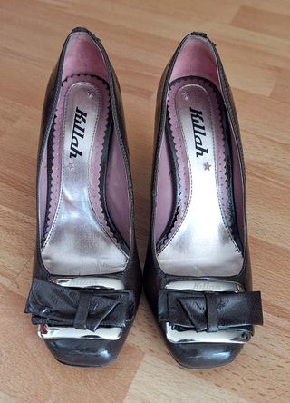 Décolleté Killah mod. Emily in pelle e similpelle marrone. Punta squadrata caratterizzata da fibbia in metallo color argento con logo e fiocchetto. Tacco alto 9 cm. In ottimo stato, con scatola e gommini di ricambio per il tacco. Numero 36