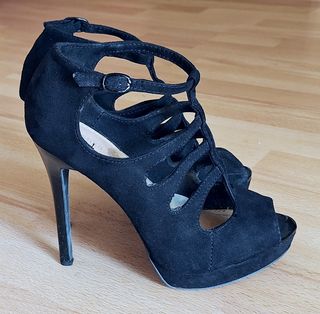 Scarpe col tacco Bershka nere scamosciate con cinturino regolabile alla caviglia. Modello open toe con tacco alt 11 cm e plateau di 2 cm. Sulla soletta interna è stata applicata uana soletta in gel. In ottimo stato. Numero 36