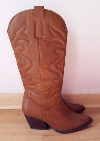 Stivali stile cowboy in similpelle color cuoio. Modello a punta con bella lavorazione sul gambale e cerniera sul lato interno. Tacco alto 6 cm e largo 4x6 (sulla base); h del gambale 31 cm misurando dal tallone alla cima. In ottimo stato. Numero 37