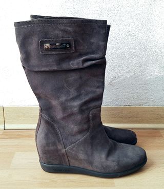 Stivali Nero Giardini made in Italy Velour Carbone L. in pelle scamosciata grigia. Suola in gomma antiscivolo; targhetta in metallo con logo sul lato esterno. Zeppa di 2,5 cm + rialzo interno, per un totale di circa 8,5 cm di altezza. Altezza totale gambale incluso 31,5 cm. Nuovi con scatola, prezzo di acquisto €139,50. Numero 38