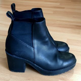 Stivaletti Divided in similpelle nera con inserti elastici laterali. Tacco di 7,5 cm e plateau di 1,8 cm circa; suola in gomma. Qualche graffio, visibile in foto, ma complessivamente in condizioni molto buone. Numero 36