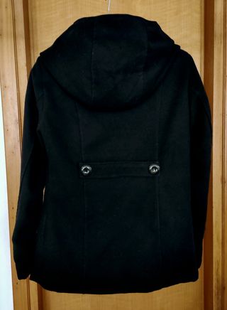 Cappotto corto in panno nero (poliestere e viscosa), con fodera interna. Chiusura con bottoni; tasche; cappuccio rimovibile mediante bottoni. Mostrine sul fondo manica; leggera imbottitura sulle spalle. Ha anche cintura da annodare in vita a piacere (non presente in foto). In ottimo stato. Taglia M: spalle 40 cm, petto 47,5 cm, maniche 60,5 cm, vita 44,5 cm, fianchi 50,5 cm, lunghezza 65,5 cm