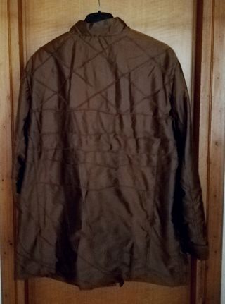 Piumino Piazza Italia in poliestere marrone scuro. Chiusura con cerniera nascosta e bottoni; polsini in maglia elastica. Tasche con cerniera e con bottoni a pressione + una tasca con cerniera su una manica. Molto caldo ma non ingombrante, in ottimo stato. Taglia XXL donna: spalle 51,5 cm, petto 61 cm, maniche 68 cm, lunghezza 79 cm