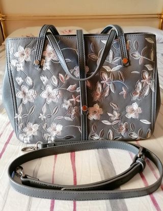 Borsa tote di un bellissimo grigio chiaro con delicato ricamo floreale in tonalità argento e oro rosa. C'è un lieve difetto vicino a uno dei bottoni a pressione, dove il materiale presenta una piccola crepa. Ciò non compromette l'uso della borsa.
