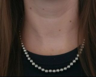Usata un paio di volte, in ottime condizioni. È realizzata in acciaio inox, un grande vantaggio perché non annerisce, resistente all'acqua e ipoallergenica. Si tratta di un modello multistrato con catene a maglia e piccoli dischetti/paillettes.