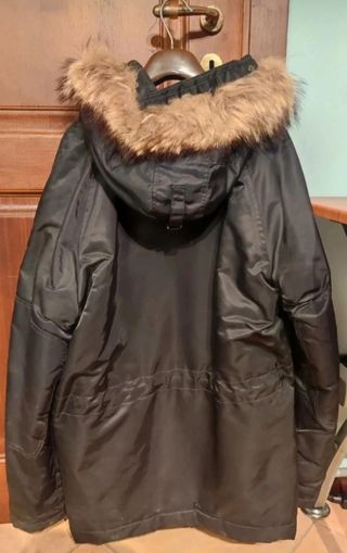 Parka pesante nero satinato GAS Basic perfetto per l'inverno, usato ma in ottime condizioni. Taglia: M (vestibilità comoda). Chiusura: doppia protezione con robusta cerniera centrale e 3 bottoni ad asola sulla parte superiore per un look stile militare. Dotato di numerose tasche sia esterne (frontali e manica) che interne, utilissime per smartphone e portafoglio. Ampio cappuccio foderato internamente con bordo in eco-pelliccia removibile tramite bottoni. Coulisse interna in vita per regolare la vestibilità e polsini protettivi. Materiali: esterno nylon tecnico pesante; interno fodera trapuntata con imbottitura termica sintetica.
