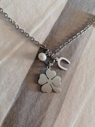 Bracciale 2 Jewels in acciaio inossidabile con ciondoli portafortuna (quadrifoglio e ferro di cavallo) e una perla. Va dai 16,5 ai 20 cm (c'è la catenina di prolungamento). Usato una o due volte, in ottime condizioni.