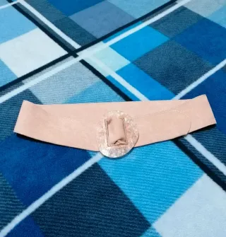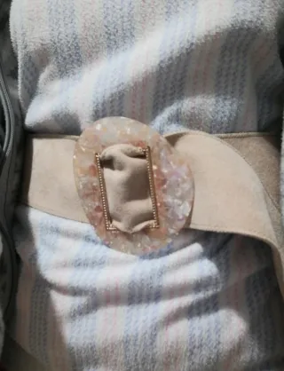Vendo quest'elegante cintura regolabile in similpelle scamosciata beige con fibbia effetto madreperla nei toni del rosa. Larghezza 7 cm. Lunghezza massima 108 cm (solo fascia). Usata una volta, in perfetto stato.