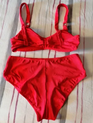 Costume due pezzi color rosso acceso, marca Piombo. Il top è una taglia 2 S, a fascia, con coppe leggermente imbottite per un ottimo supporto e spalline impreziosite da eleganti fibbie decorative in metallo, che donano un tocco di stile in più. La parte sotto è a vita alta, taglia 3 M, con una vestibilità comoda e modellante. Il costume è in buone condizioni generali, lo slip ha solo un leggero segno di usura sul retro, quasi impercettibile (come mostrato in foto).