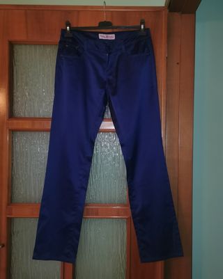 Pantalone a gamba dritta, effetto lucido. Blu elettrico scuro, taglia 28/M.