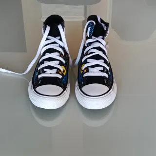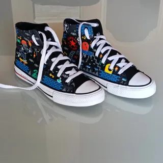 Scarpe Converse alte per ragazzo, ispirate al mondo di Minecraft. Nuovo senza cartellino indossate solo per la prova - Fantasia a tema videogioco. - Chiusura con lacci bianchi. - Suola in gomma bianca.