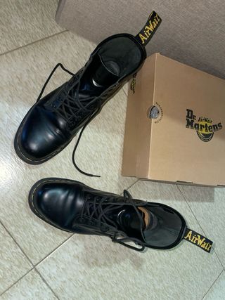 Stivaletti Dr. Martens in pelle lucida. - Modello classico a 8 occhielli. - Suola con cuciture gialle. - Tirante posteriore con logo.