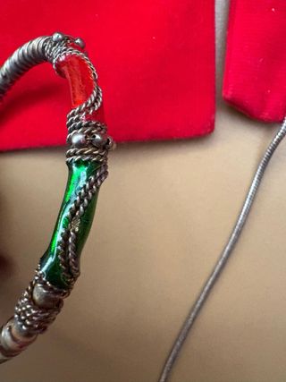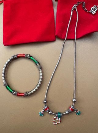 Set natalizio composto da girocollo e bracciale, perfetti per le feste. - Girocollo con ciondoli a tema natalizio smalti da entrami i lati - Bracciale rigido con inserti e smalti colorati.
