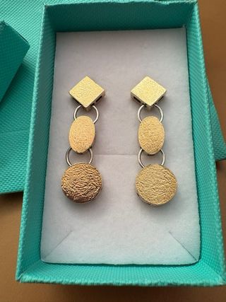 Eleganti orecchini pendenti con elementi a forma di rombo e ovali. - Design a cascata. - Montatura in argento color oro. completo di sacchetto e cornetto in ceramica