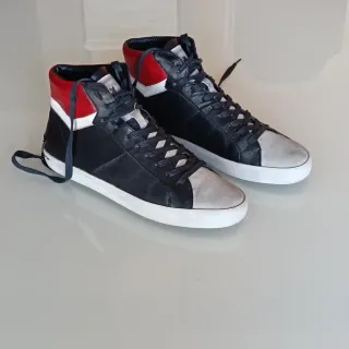 Scarpe alte da uomo Crime London. - Tomaia in pelle nera con inserti grigi. - Dettagli rossi sul tallone e sul collo del piede. - Suola bianca in gomma. Fodera in pelle plantare anatomico