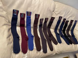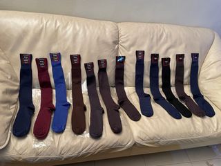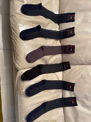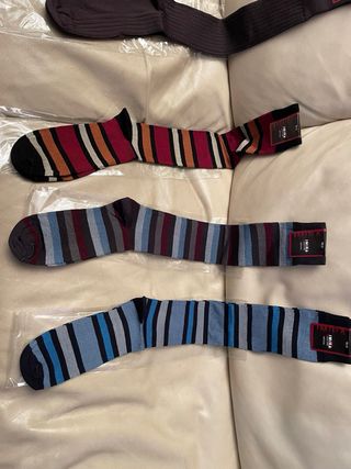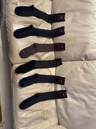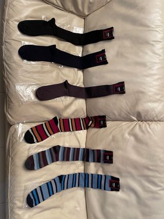 Lotto composto da 6 paia di calzini lunghi. - Fantasia a righe colorate. - Fantasia a righe bicolore. - Calzini neri. - Calzini viola melanzana. - filo di Scozia - taglia 12