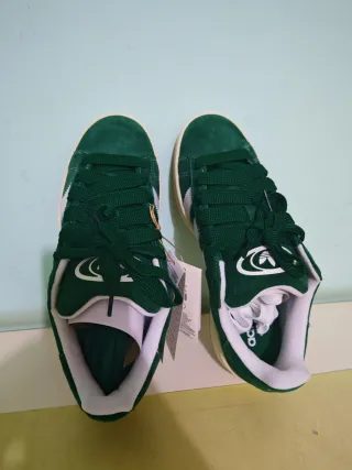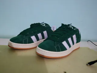 Scarpe Adidas Campus in camoscio verde. Design classico con le iconiche tre strisce. Vendo per errata misura,mai usate..solo provate in casa - Tomaia in morbido camoscio. - Suola in gomma resistente. - Dettagli a contrasto sulle strisce e sul tallone.
