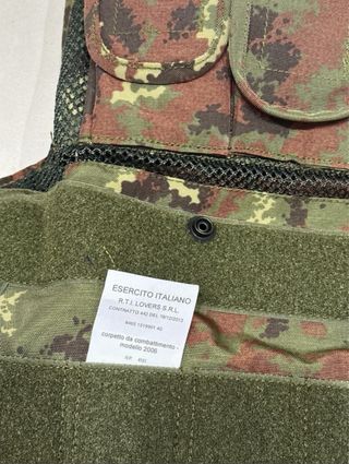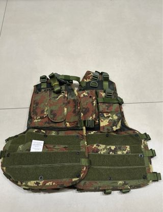 Corpetto tattico mimetico dell'Esercito Italiano. - Design mimetico con pattern italiano. - Spallacci regolabili con fibbie. - Tasche multiple frontali. - Sistema di aggancio MOLLE.