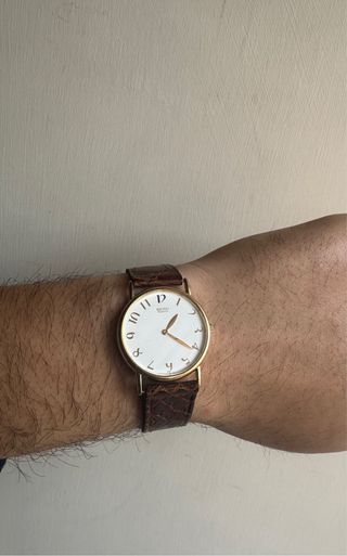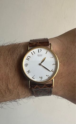 Elegante orologio Seiko con cinturino in pelle. - Cassa color oro. - Cinturino in pelle marrone con texture. - Quadrante bianco con numeri arabi. perfettamente funzionante