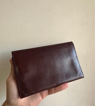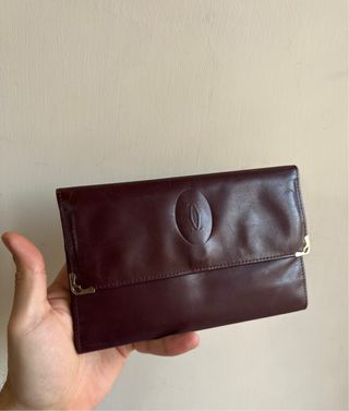 Elegante portafogli Cartier in pelle marrone. - Logo Cartier inciso. - Dettagli metallici dorati agli angoli.