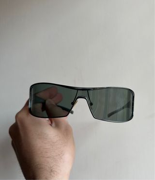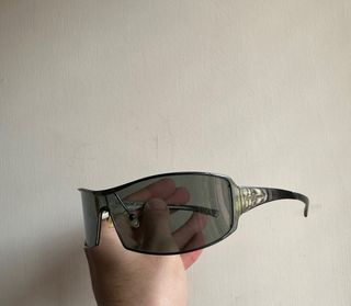 Occhiali da sole Giorgio Armani in stile Y2K. - Montatura con dettagli colorati. - Lenti grigie sfumate.