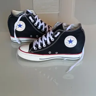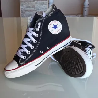 Scarpe alte Converse da donna. - Modello iconico Chuck Taylor. - Tomaia in tela. Alto alla caviglia e zeppa interna posteriore. Per le relative misure riferente altezza zeppa (vedi foto allegate) - Chiusura con lacci bianchi. - Suola in gomma.