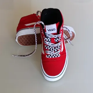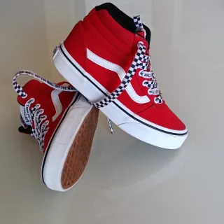 Scarpe alte Vans per bambino, taglia 30. - Colore rosso con dettagli bianchi. - Lacci a scacchiera e con scritta Off The Wall. - Suola in gomma.