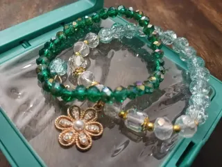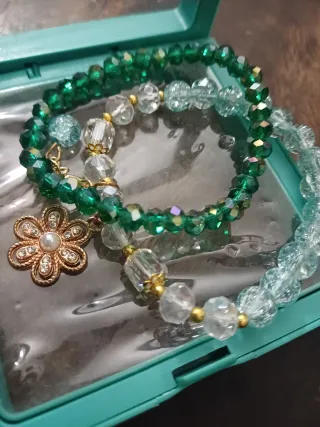 Set di braccialetti con charm a forma di fiore e perline colorate. - Braccialetti con perline verdi e trasparenti. - Charm a forma di fiore con strass e perla centrale. - Include una scatolina per conservarli.