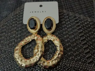 Eleganti orecchini pendenti con finitura dorata e dettagli in pietra nera. - Design a cerchio martellato. - Pietra centrale ovale. - Chiusura a perno.