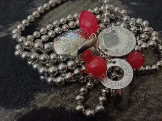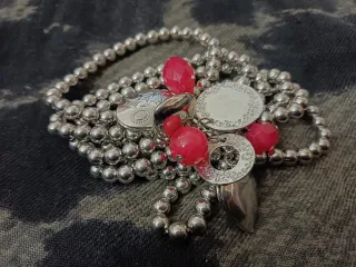 Elegante bracciale con perle argentate e ciondoli decorativi. - Perle tondeggianti color argento. - Ciondoli a forma di medaglione e cerchio. - Dettagli con pietre color fucsia.