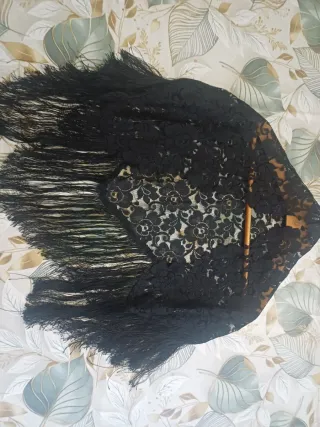 Elegante sciarpa vintage in pizzo nero, perfetta per aggiungere un tocco di classe. - Dettagli floreali ricamati. - Lunghe frange decorative. - Tessuto in pizzo delicato.