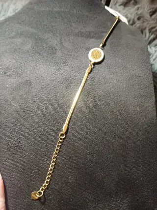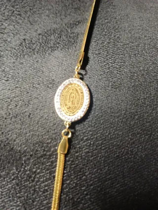 Elegante bracciale con ciondolo raffigurante la Madonnina. - Ciondolo ovale con immagine sacra. - Cornice tempestata di strass luminosi. - Catena sottile e flessibile.