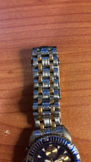 Elegante orologio da polso con quadrante blu e dettagli dorati. - Cinturino bicolore acciaio e oro. - Lunetta girevole blu con indici. - Funzione cronografo. - Datario visibile. NON FUNZIONABTE , potrebbe essere riparabile