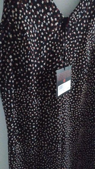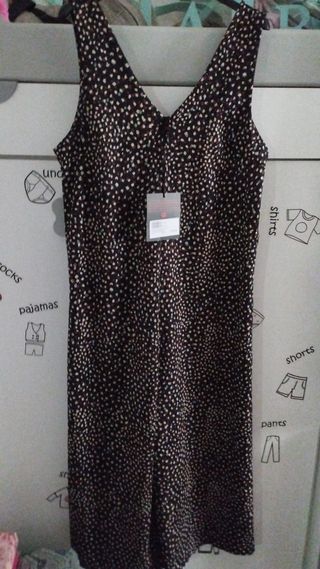 Elegante abito midi smanicato con fantasia a pois. - Modello con pantalone integrato. - Scollo a V. - Fantasia a pois bianchi su fondo nero.