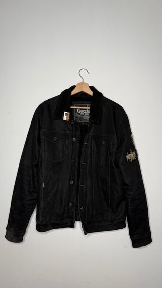 Giacca invernale Boxeur des Rues in colore nero, taglia L. Presenta un colletto foderato in pelliccia sintetica per un maggiore calore. - Chiusura frontale con bottoni. - Due tasche sul petto con patta e bottone. - Dettagli patch sulle maniche.